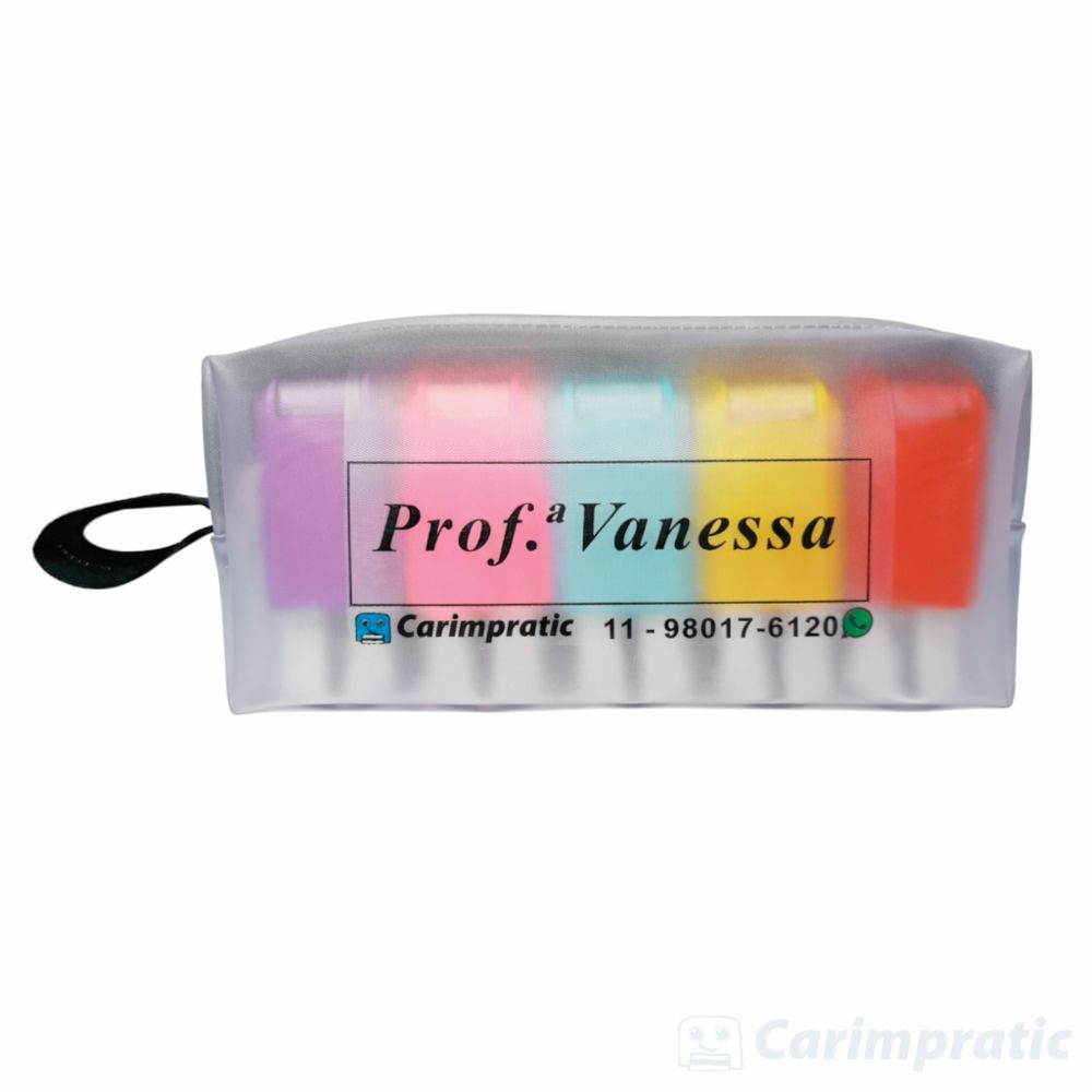 O Kit Carimbos Professor é composto por um estojo exclusivo e cinco carimbos. A área de impressão de cada carimbo é de 38x14mm.